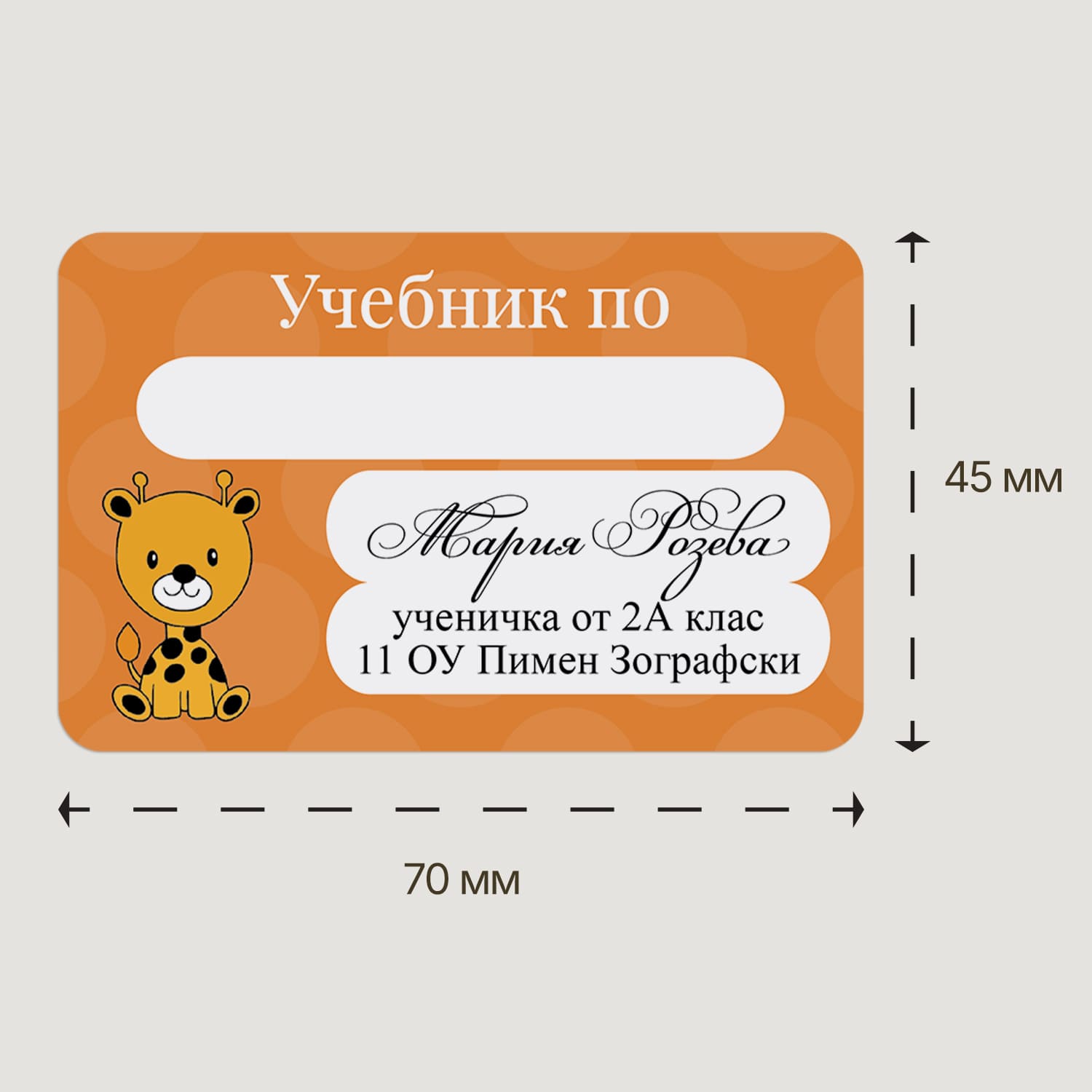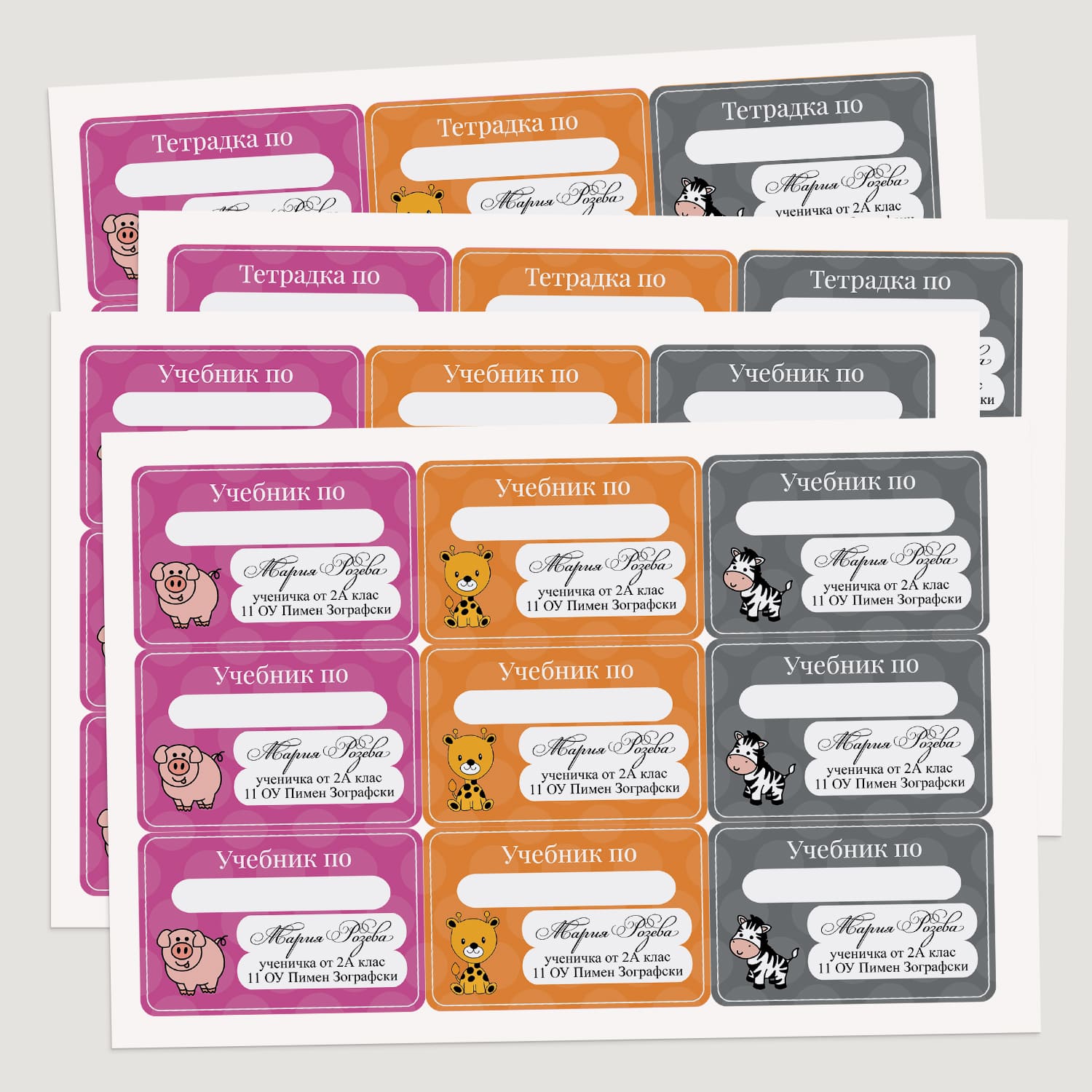 Подгответе се за новата учебна година със стил и удобство с нашите персонализирани стикери за тетрадки и учебници. Всеки етикет е създаден, за да ви помогне бързо и лесно да организирате учебните си материали, като добавите персонализизация с име, клас и училище, а за вас остава само надписването на учебния предмет! Изработени от самозалепваща хартия с ярки цветове и забавни илюстрации, нашите стикери Обратно на училище спестяват време и усилия и са незаменим практичен помощник за началото на учебната година. Подходящи са както за ученици в началното, така и в средното училище, и са перфектният начин да придадете индивидуалност на всяка тетрадка или учебник.