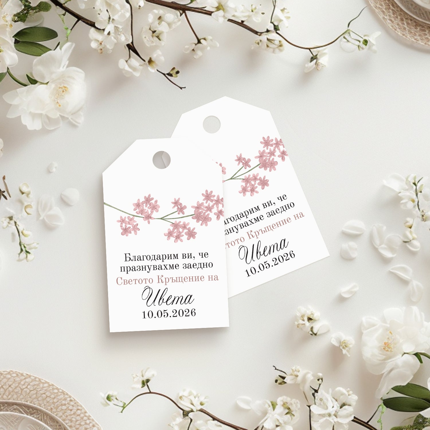 Персонализираните тагчета за кръщене са нежен и стилен начин да придадете завършен вид на празничните подаръци за гости. Те са идеални за декорация на кутийки, бурканчета, торбички със сладки или ръчно изработени сувенири. Добавят лично послание, благодарност или датата на тържеството - малък детайл с голямо въздействие. Подходящи са за кръщене на момиче или момче. Етикетите се персонализират с текст по избор и са отпечатани върху качествен картон в различни форми и цветове.