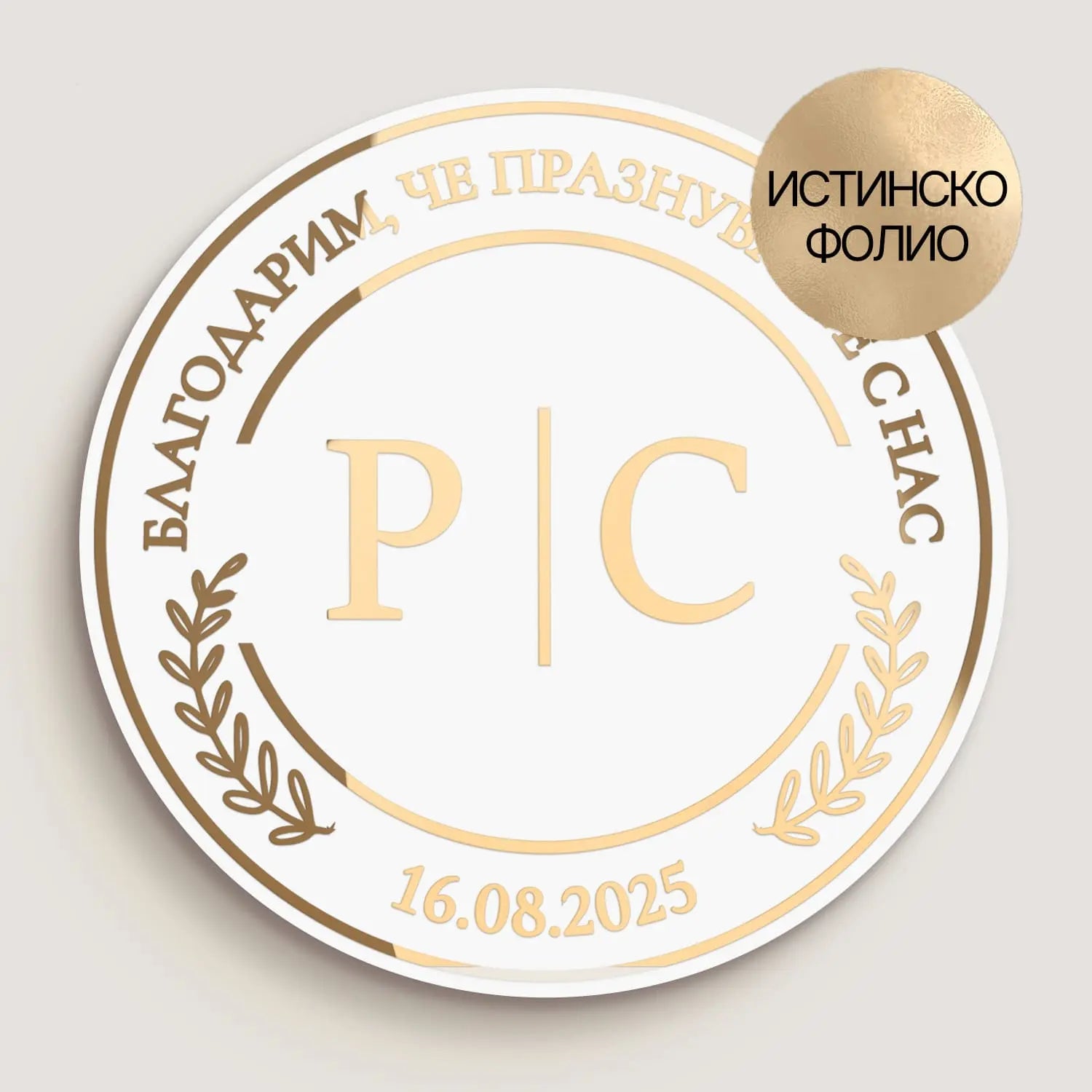 ♥ Кръгъл дизайн с флорални мотиви, подчертани инициали, дата и "Благодарим, че празнувахте с нас" послание