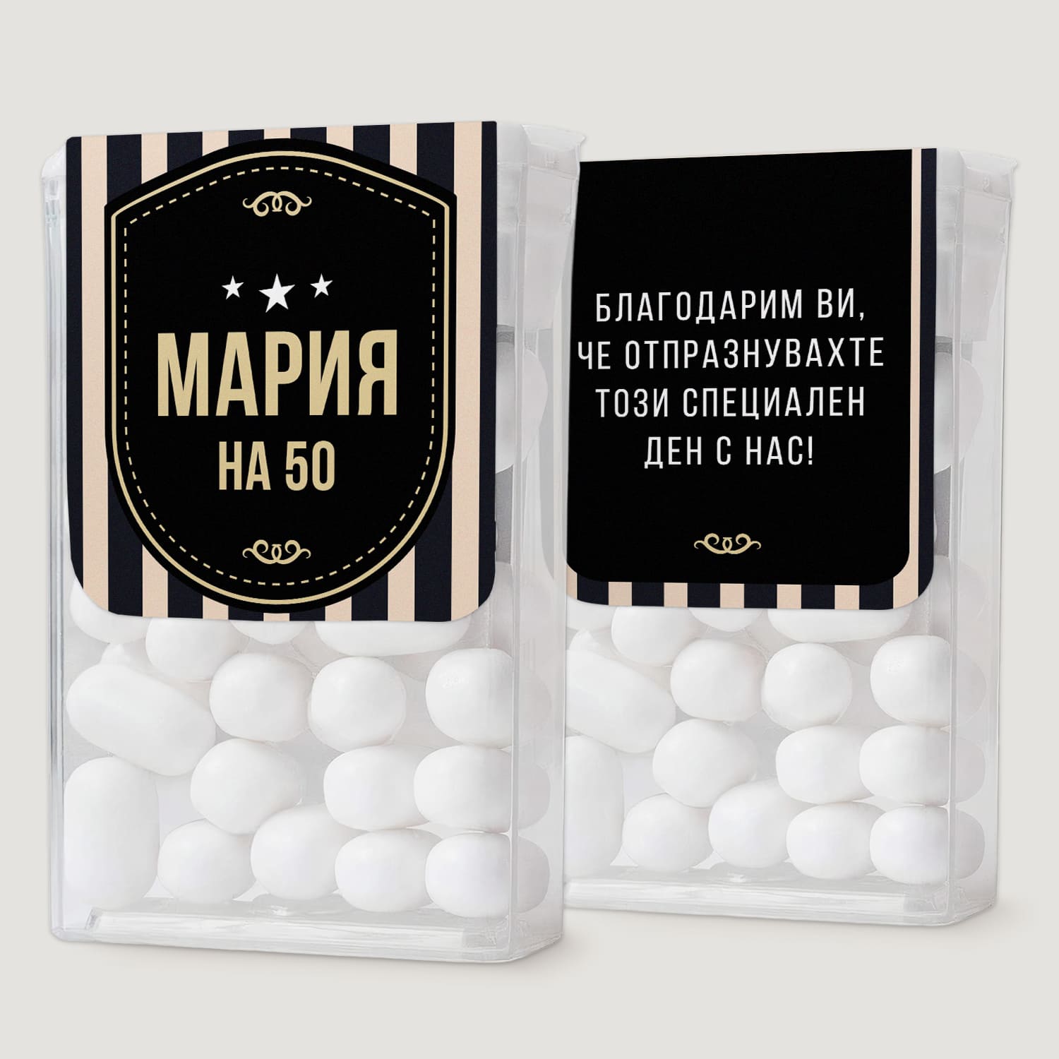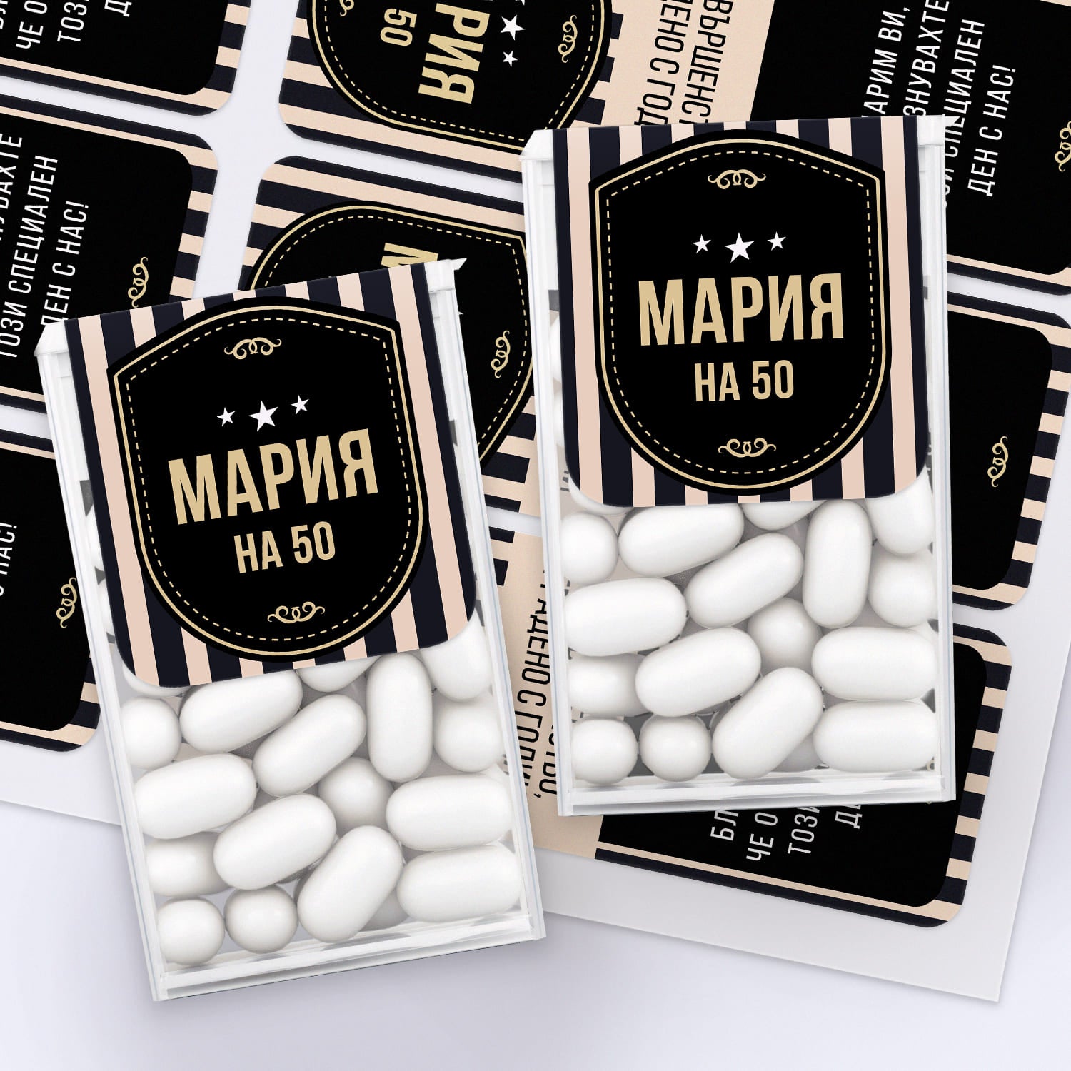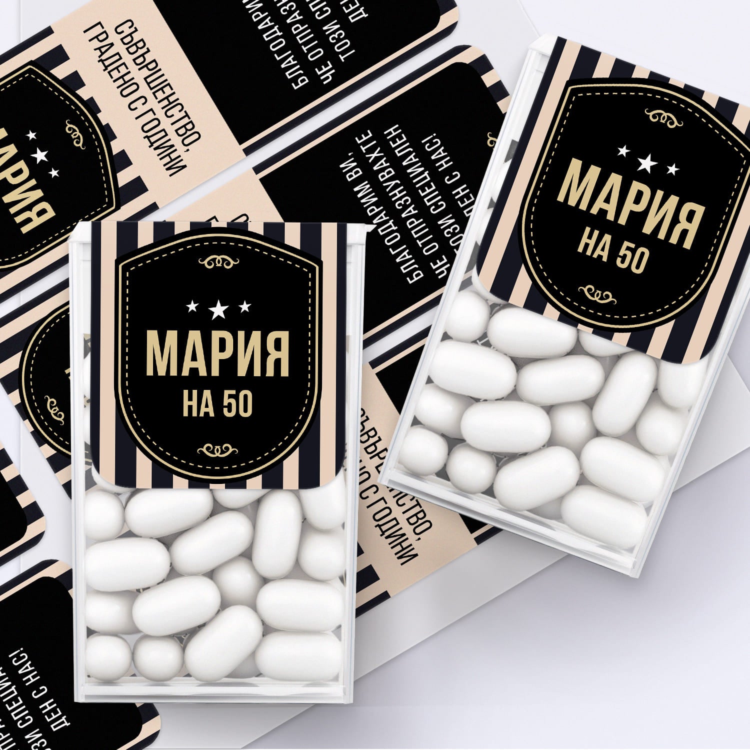 Продуктът включва само персонализирани етикети. Дражета и кутийка са само за визуализация.