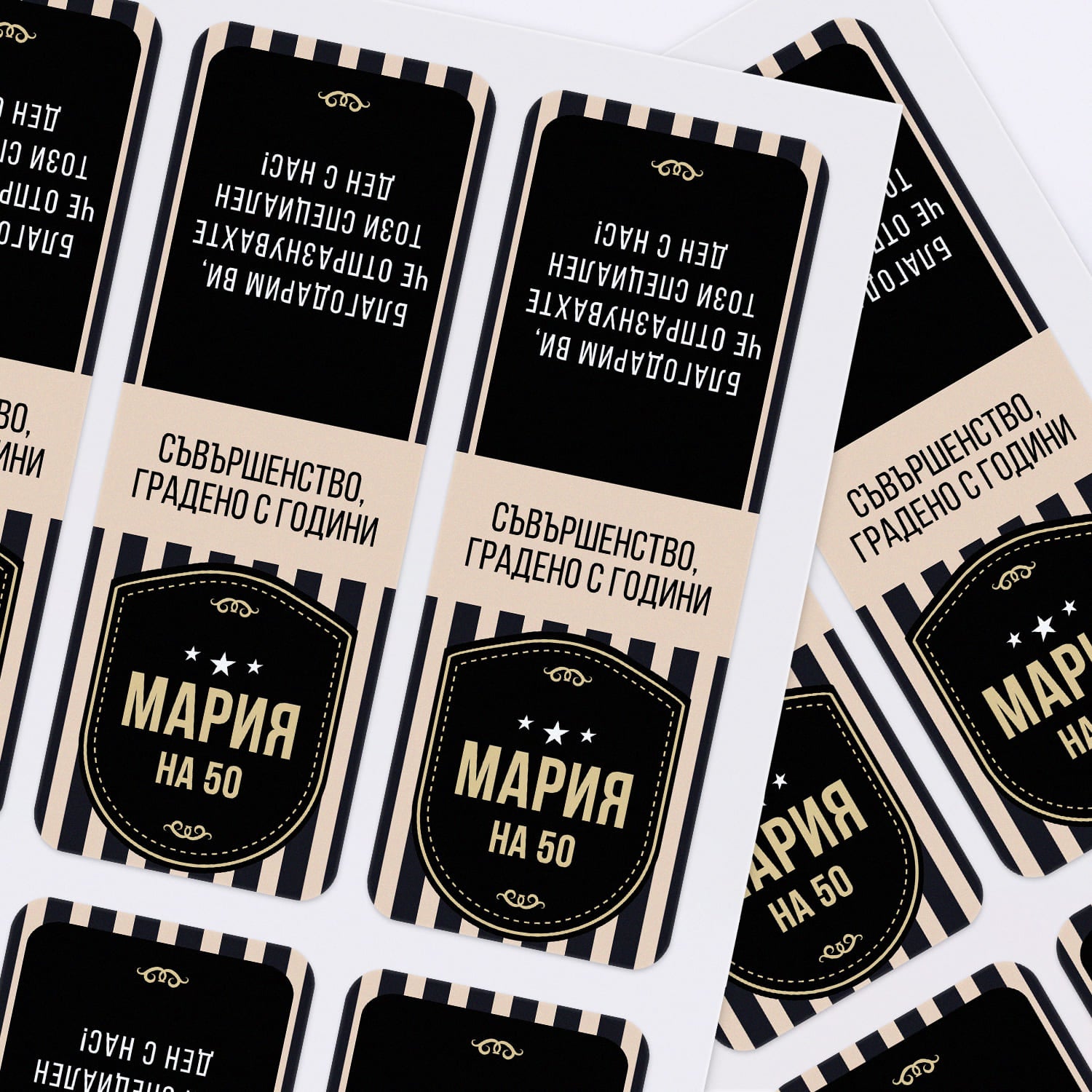 Нашите етикети са с размери, съобразени така, че да обхванат оригиналния етикет от край до край. Въпреки това, за постигане на най-добър резултат, препоръчваме първо да го премахнете преди апликиране. Ако предпочитате по-лесен вариант, можете да изберете персонализираните етикети в комплект с бели стикери, които ефективно намаляват прозрачността и прикриват оригиналния дизайн