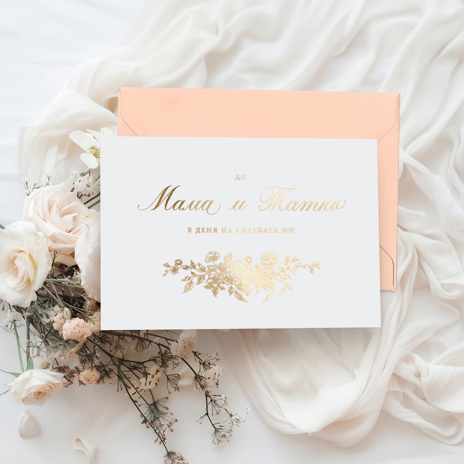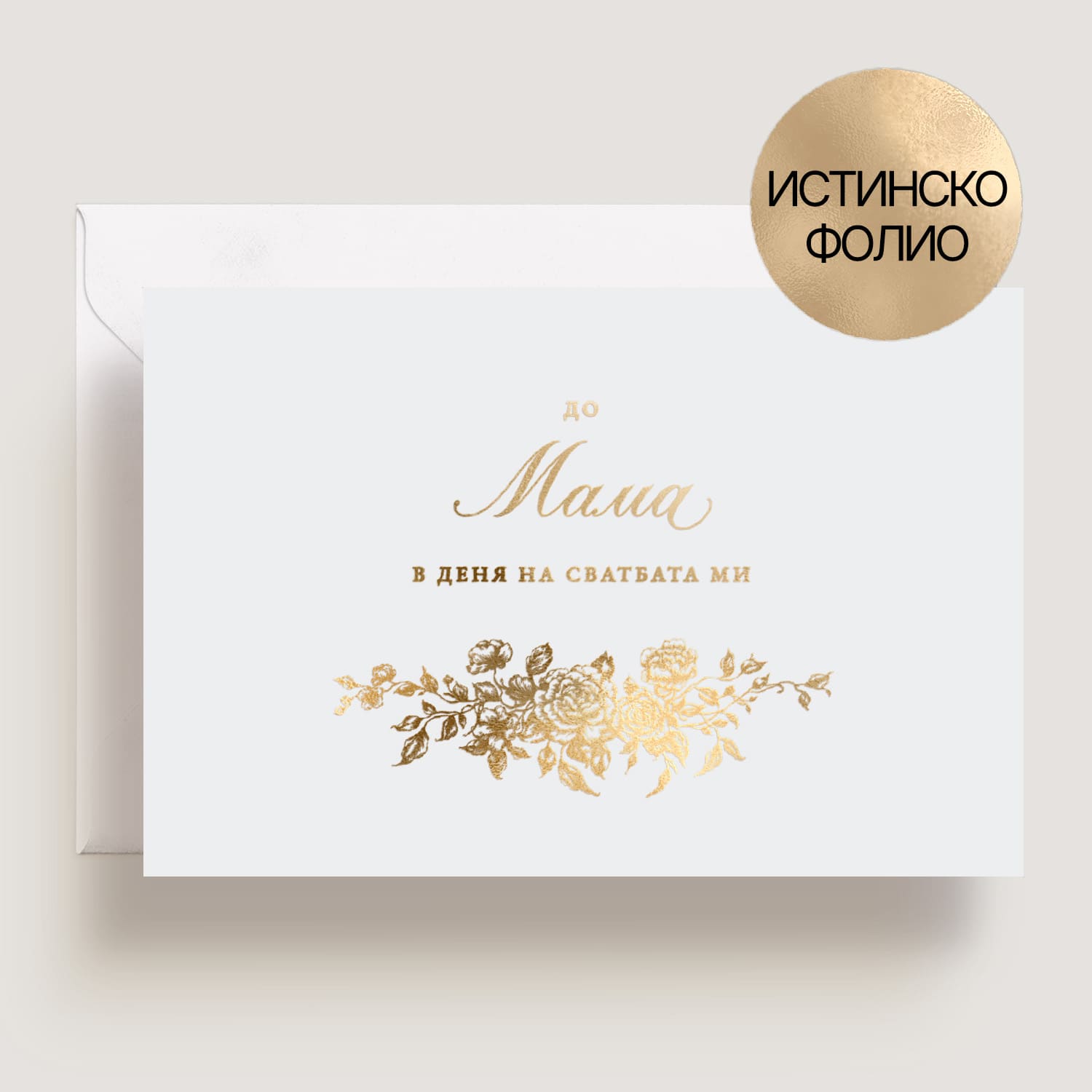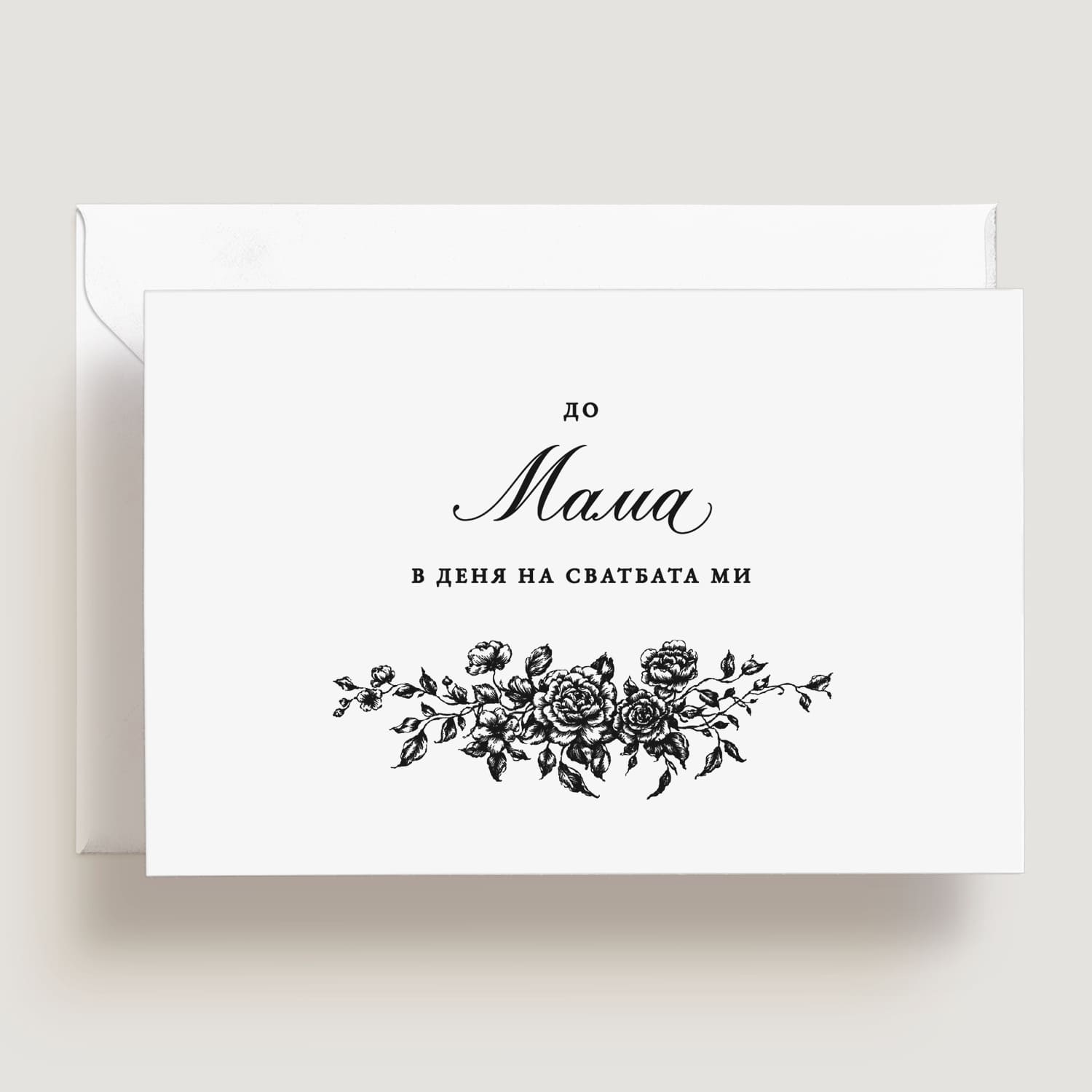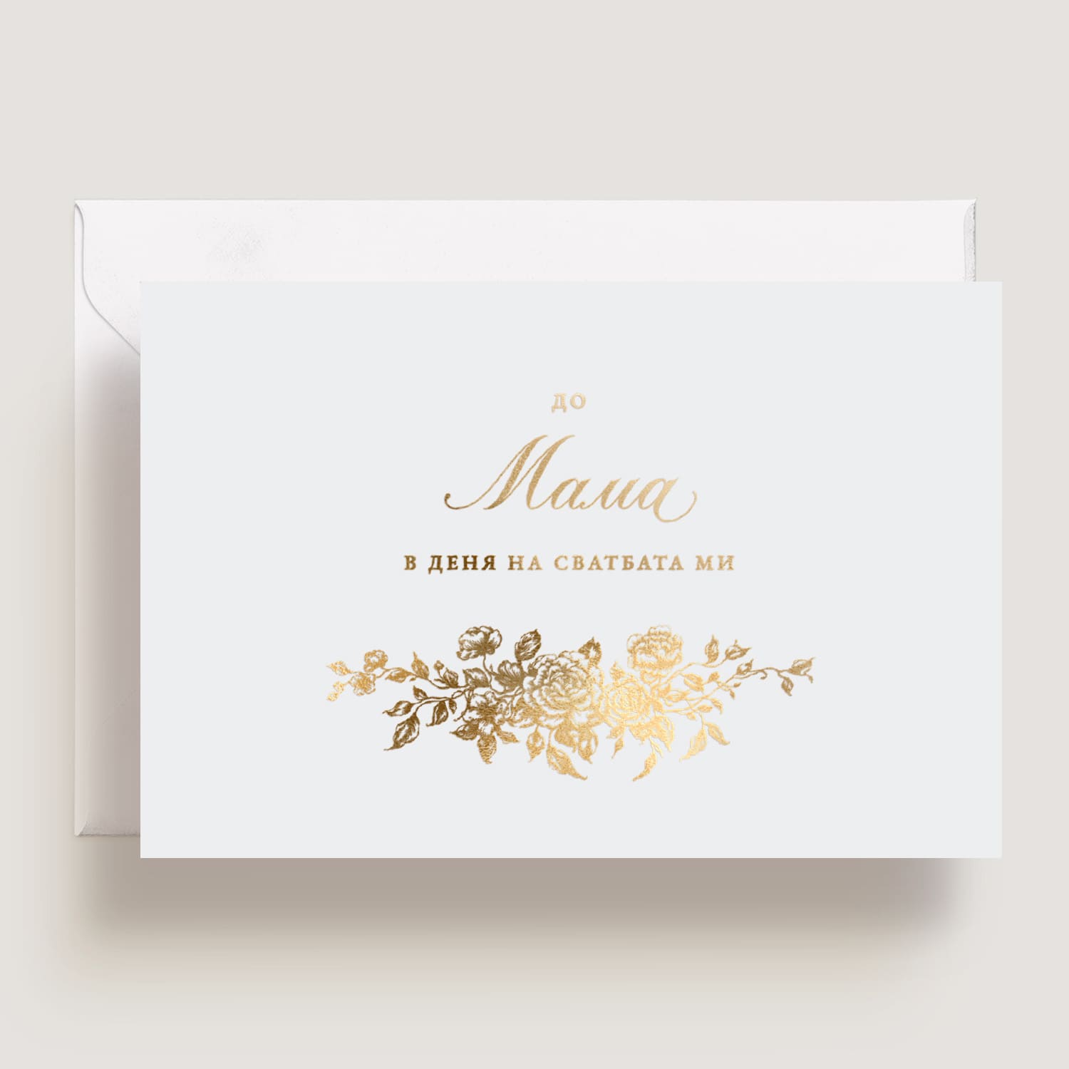 Понякога най-специалните думи се казват най-добре на хартия. Картичките тип „До моята майка/шаферка/любим/баща в деня на сватбата“ са вълнуващ начин да изразите любов, благодарност и емоция в този изключителен ден. Независимо дали искате да се обърнете към родител, бъдещ съпруг, кума, шаферка или най-добра приятелка - една персонализирана бележка с красив дизайн и топли думи остава завинаги спомен.