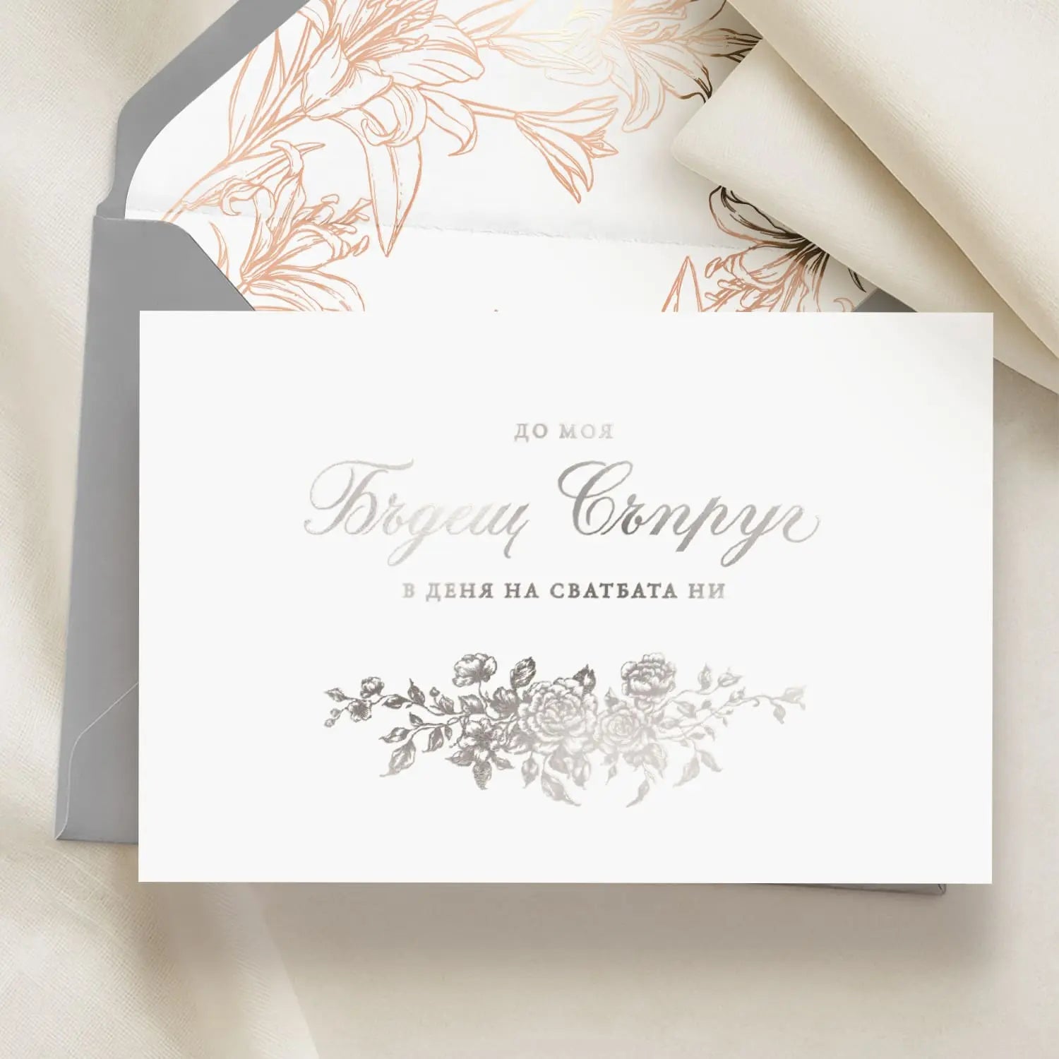 Перфектни за поставяне в подаръчна кутия, оставяне в стаята за приготовления или поднасяне лично в най-емоционалния момент преди церемонията.♥ Дизайн с изцяло ръкописен шрифт
